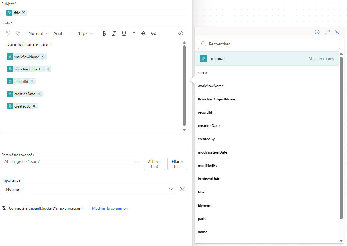 4. Power Automate peut dès lors réutiliser chacune de ces information pour le flux métier requis :
